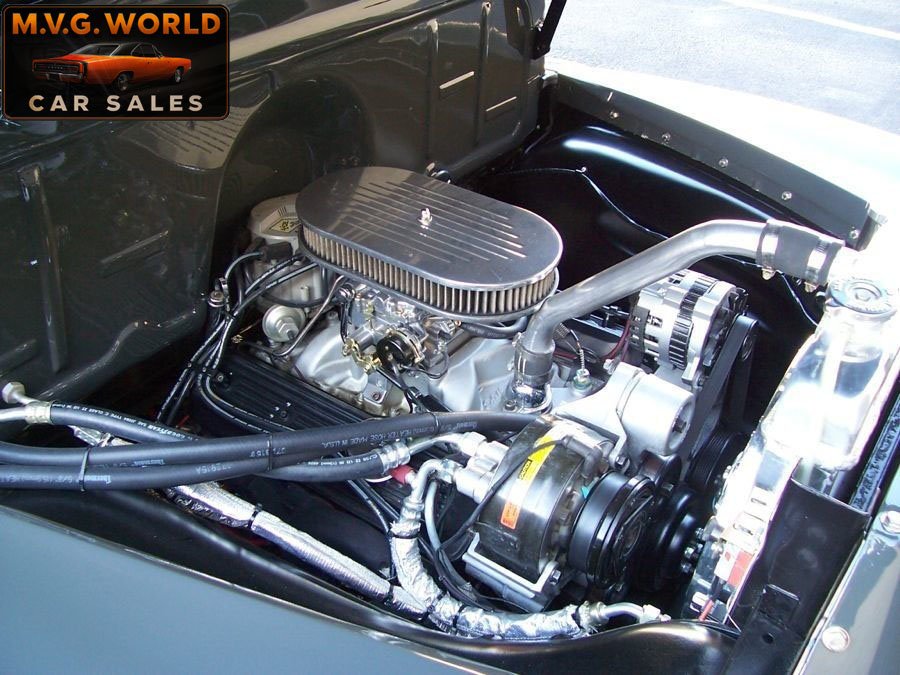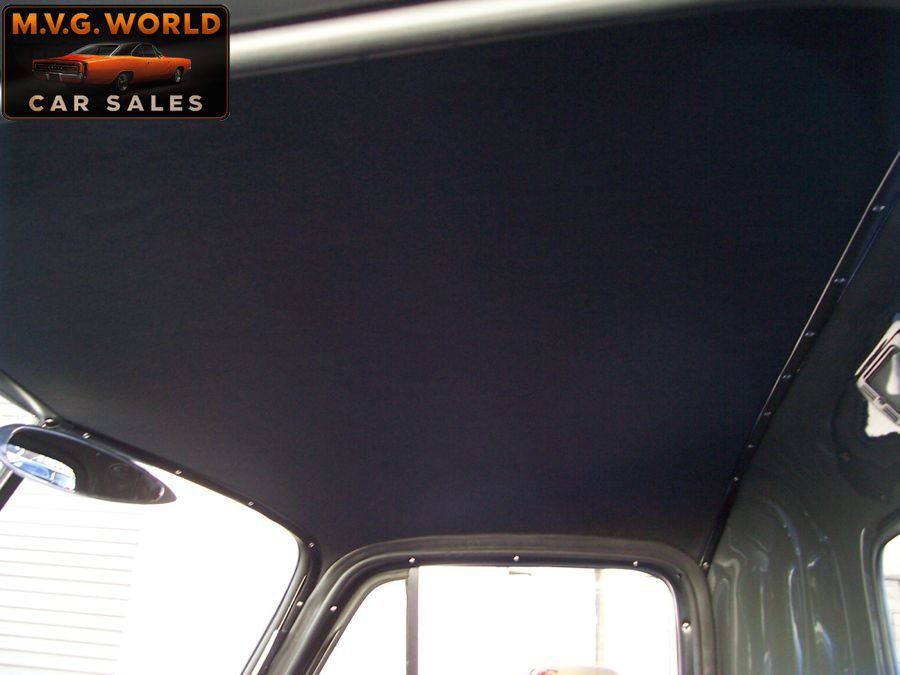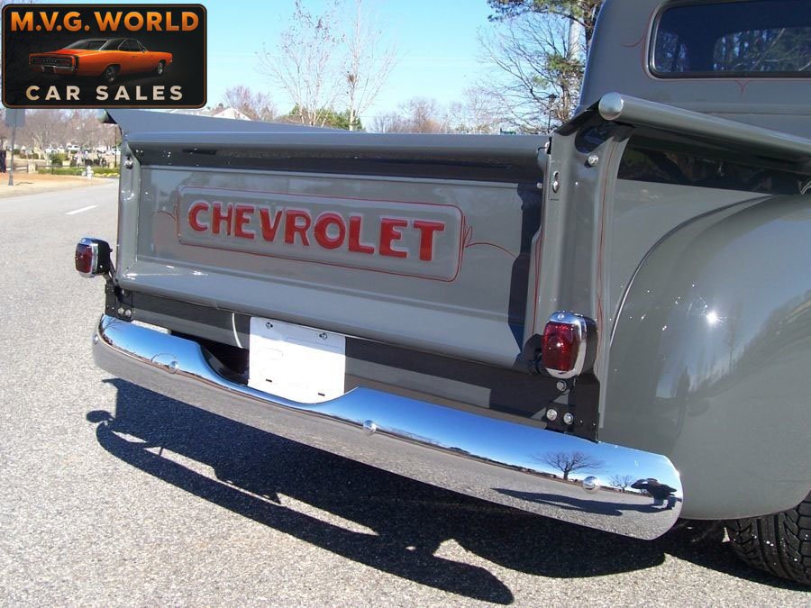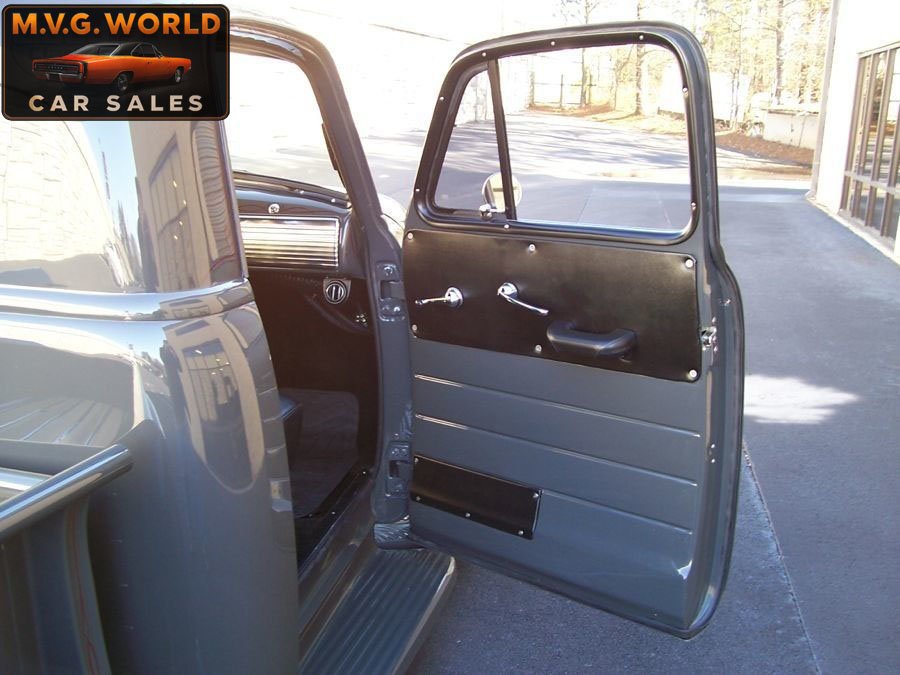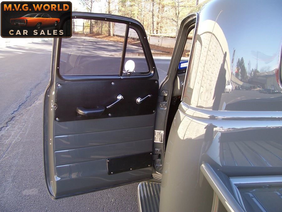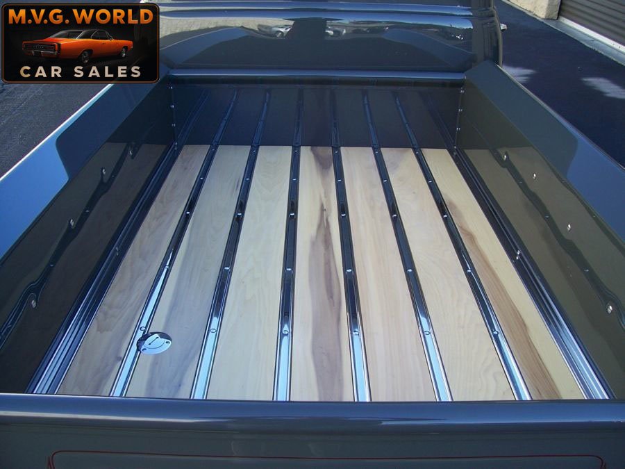 Finished in show-quality gray paint with subtle green tones and custom pinstriping, the all-steel body presents excellent fit and finish. Chrome bumpers, tinted glass, and a beautifully finished Poplar wood bed complete the exterior. A lowered stance paired with polished 17” American Racing Torque Thrust wheels and BFGoodrich G-Force tires give this truck a commanding presence.