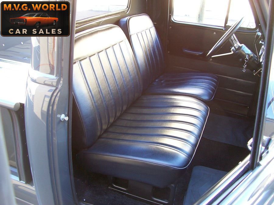 Inside, the black split bench-style seats are comfortable and adjustable, complemented by new carpeting, headliner, and updated gauges. The cabin includes a tilt steering column, upgraded wheel, modern stereo with USB, and neatly integrated A/C vents. With just 1,235 miles since restoration, this 3100 is both show-ready and highway-friendly—an ideal blend of classic looks and resto-mod usability.
