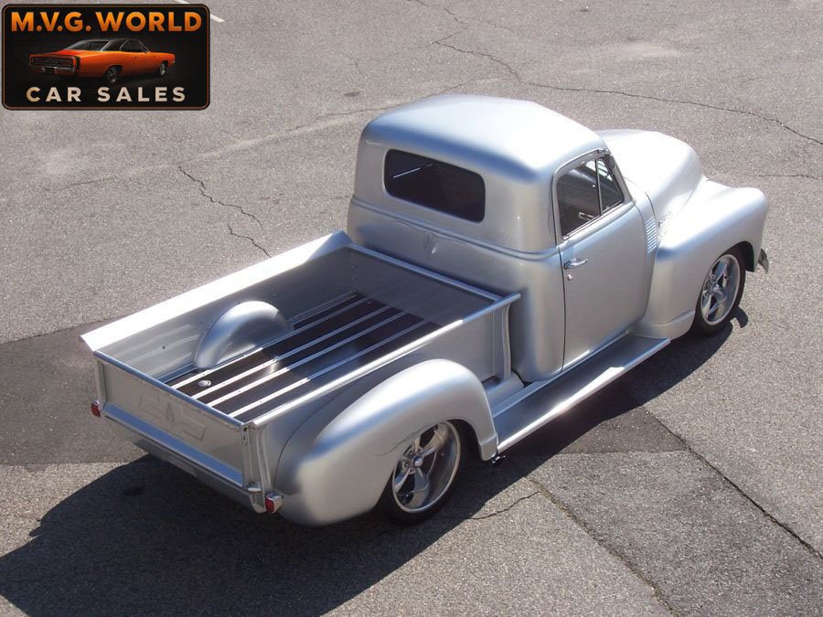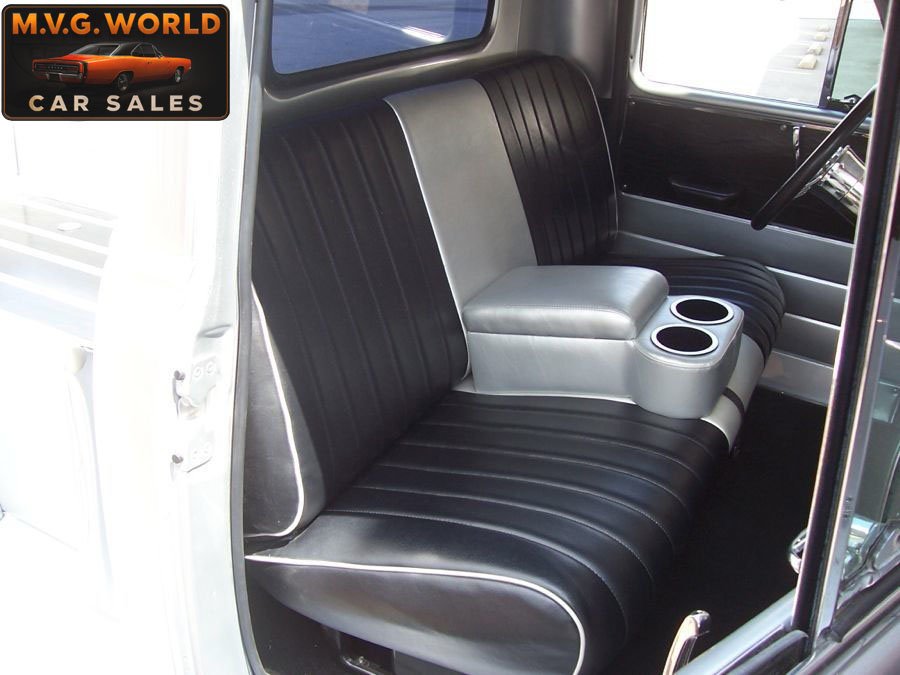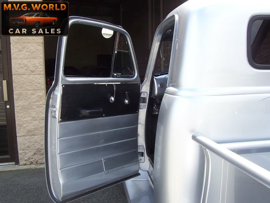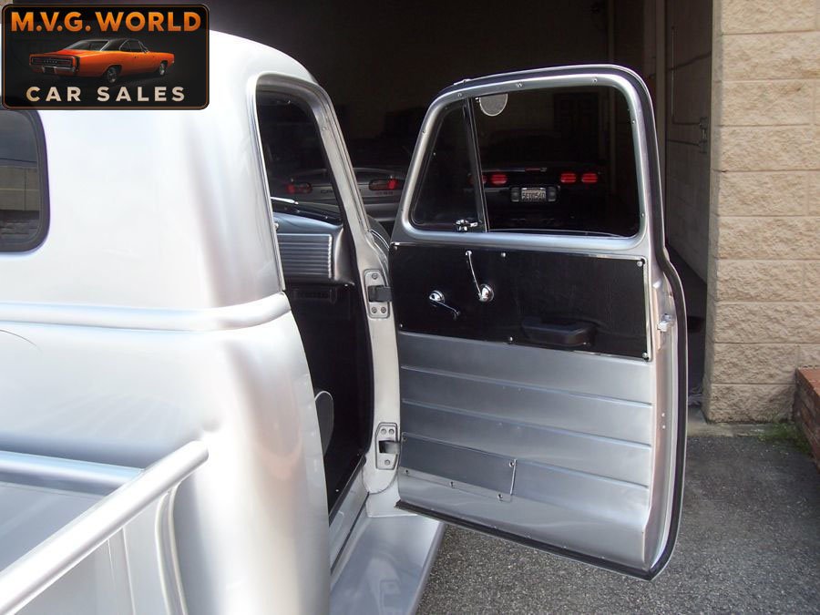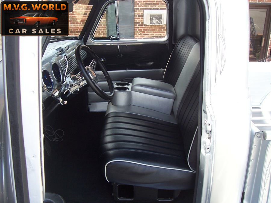 The all-steel body retains original cab, doors, and bed, complemented by wider fiberglass rear fenders to accommodate 20” rear and 18” front Show Wheels wrapped in Toyo tires. Fit and finish are excellent, with tinted glass, new chrome, and a dark wood bed featuring relocated fuel tank.