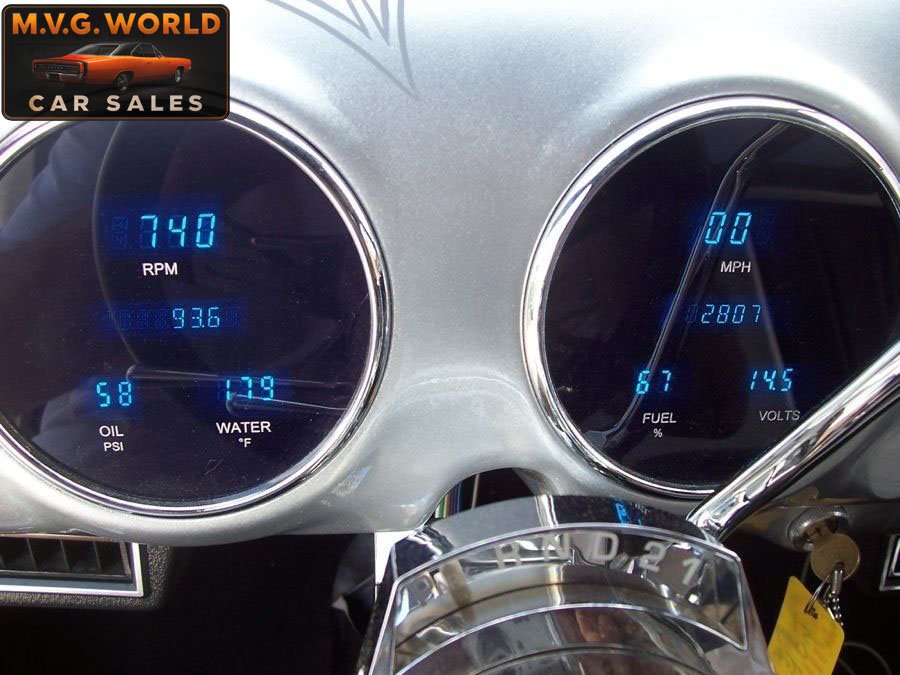 Inside, the custom black and silver bench seat with removable console provides comfort and practicality. Features include Flaming River tilt steering column, Dakota Digital gauges, Vintage Air A/C and heat, and a RetroSound stereo with subwoofer. Thoughtful details such as pinstriping accents and unique dash touches complete the cabin.