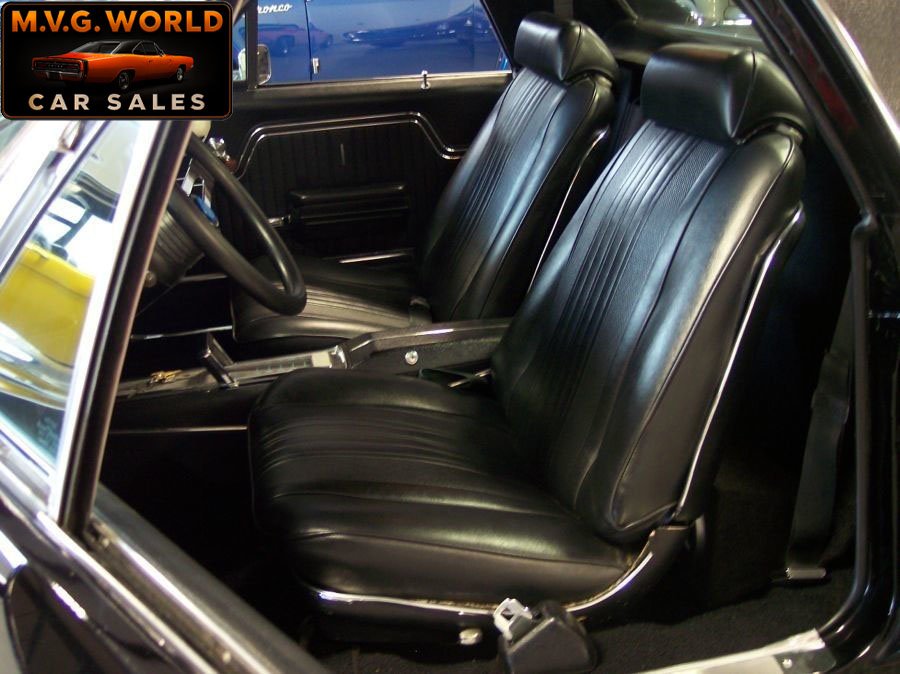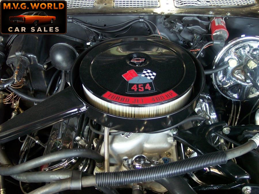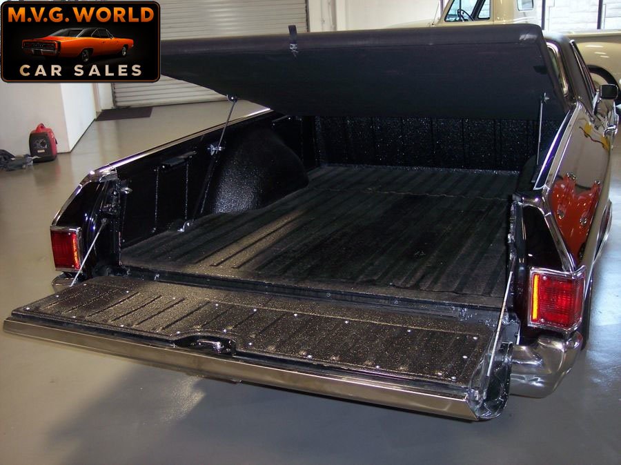 This striking El Camino is finished in Tuxedo Black with black vinyl top and black interior, offering a sharp muscle car/truck combination. Power comes from a rebuilt 454ci V8 with Edelbrock Performer intake, 4-barrel carburetor, headers, and dual exhaust, estimated at 350 hp. A Turbo 400 automatic transmission, power steering, and power front disc brakes make it a strong yet comfortable driver, while factory air conditioning has been updated to R134.