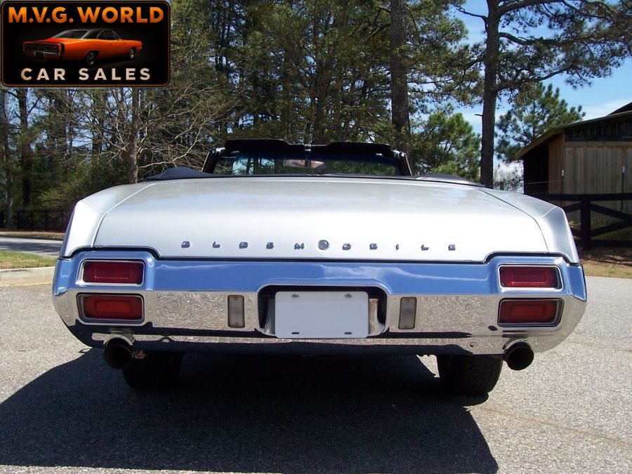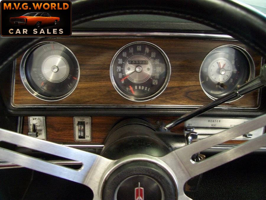 This SX underwent a frame-off restoration about 3 years ago, including a full repaint in its original color, fresh chrome and trim, and a black convertible top with glass rear window and matching boot cover. A 442-style dual-scoop hood and black stripes add muscle car presence, while original SX features like the trumpet exhaust tips and rear bumper cutouts remain. Body and panel fit are excellent, with only a few minor cosmetic blemishes noted.