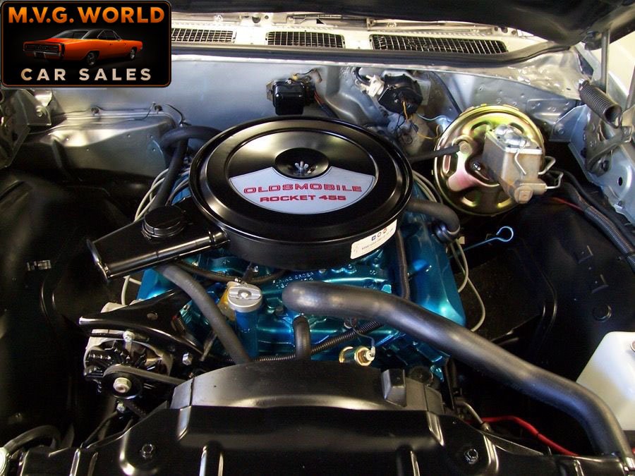 Under the hood, a strong 455ci 4-bbl V8—rebuilt during the restoration—delivers smooth, effortless power through a Turbo 400 automatic. Factory power steering, power front disc brakes, dual exhaust, and W-27 rear end make this SX a dream to drive. The undercarriage and engine bay are detailed to show standards, and it rides on factory Oldsmobile wheels with white-letter radials.