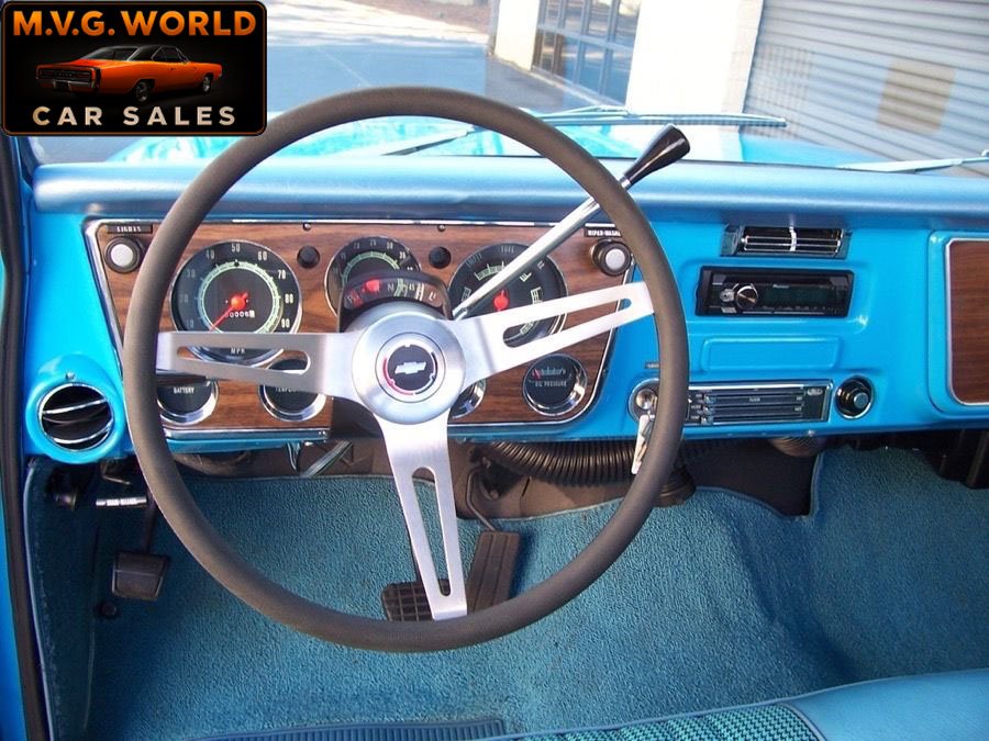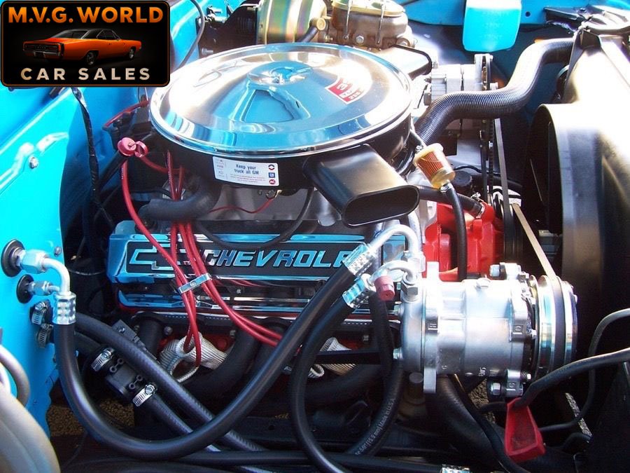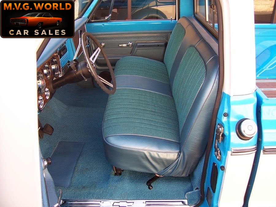 Inside, the blue/black houndstooth bench seat is freshly upholstered, with new panels, carpeting, and a woodgrain-accented dash featuring updated gauges and a working in-dash tach. Comfort features include a Pioneer stereo system, tilt steering, sliding rear glass, and seat belts. With under 1,000 miles since restoration, this Cheyenne Super is turn-key, show-quality, and ready to enjoy.