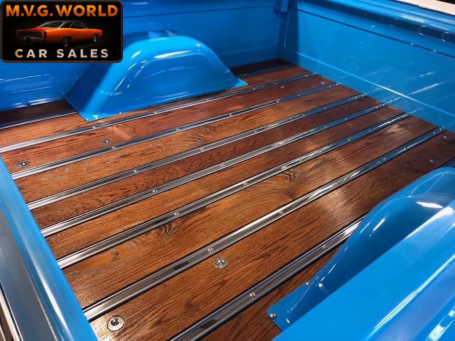 The exterior is finished in a striking blue and white two-tone with fresh trim, emblems, and chrome. Panel fit is excellent, paint is slick and show-ready, and the oak wood bed with stainless strips adds classic appeal. The truck rides on 20” Ridler wheels with staggered tires (275/40 rear, 245/35 front).